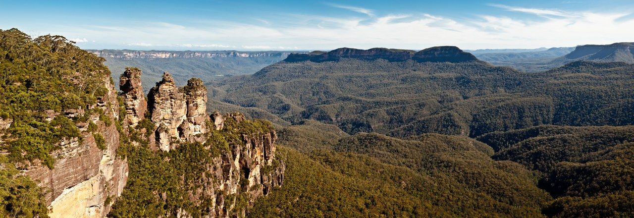 Bien sûr, quand on parle des Blue Mountains on pense généralement aux « Three Sisters », prises ici en panoramique un jour de grand beau temps, ce qui n’est pas toujours le cas dans le coin ! Leur nom provient d’une légende aborigène. Trois sœurs (Meehni, Wimlah et Gunnedoo) sont tombées amoureuses de trois hommes d’une tribu voisine, or leur union était interdite par la loi aborigène. Mais ces hommes n’étaient pas enclins à accepter la loi et sont venus enlever les sœurs par la force. Un ancien a alors transformé les sœurs en rochers pour les protéger, mais a péri dans la bataille ; personne ne pouvait donc ramener les « three sisters » à la vie.